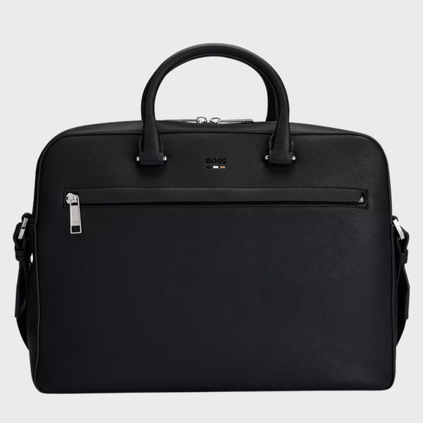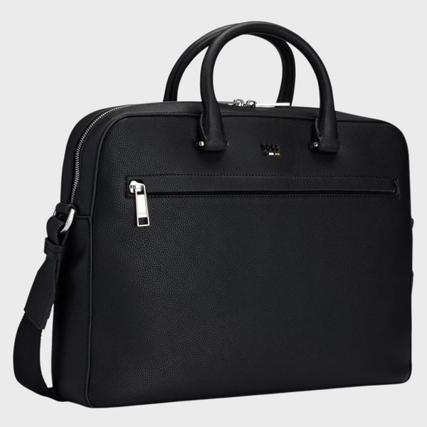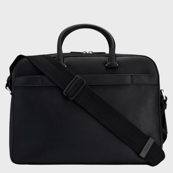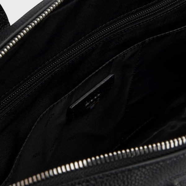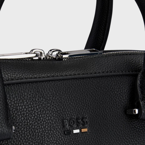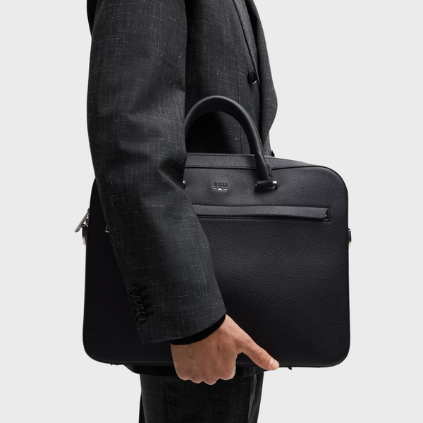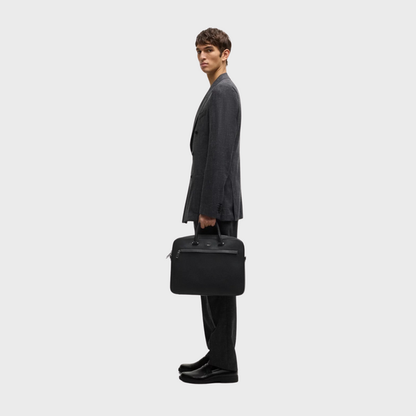 A modern document case by BOSS. Featuring a signature stripe and logo, this accessory is crafted in grained synthetic coated fabric. Synthetic coated fabric, sometimes referred to as faux leather, is a fabric designed to resemble real leather, and/or display a matte, glossy, smooth, or textured, coated appearance. This product is partly created with recycled polyester. We at HUGO BOSS prefer recycled polyester from pre- and post-consumer textile waste and do our best to phase out polyester from PET bottles. The aim of using recycled materials is to save valuable resources. Measurements: 29 x 38 x 7cms. Length: 38,0 cm Width: 7,0 cm Height: 29,0 cm Fastening top: Zip closure 1 inside zip pocket Outside embossed logo Double handle Packaging: Dust bag