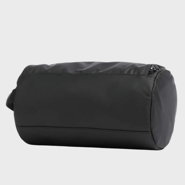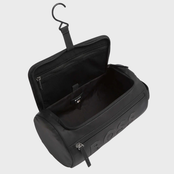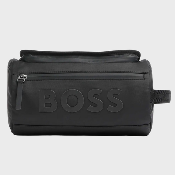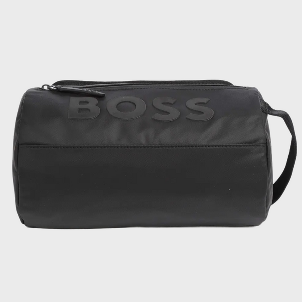 A signature washbag in smooth synthetic coated fabric with a silicone logo detail, lateral handle and front zipped pocket. Measurements: 27 x 15 x 15cm. Fastening top: Zip closure