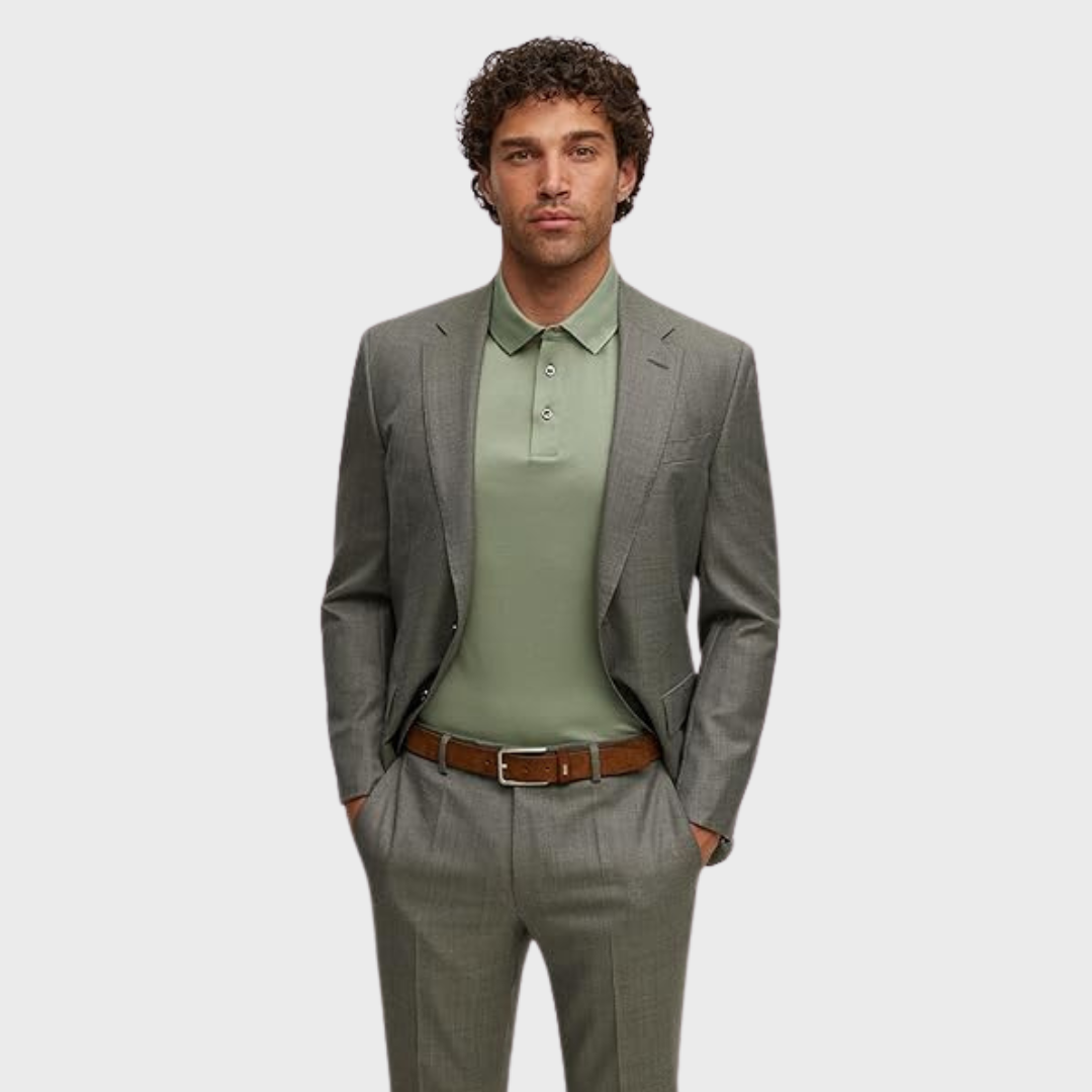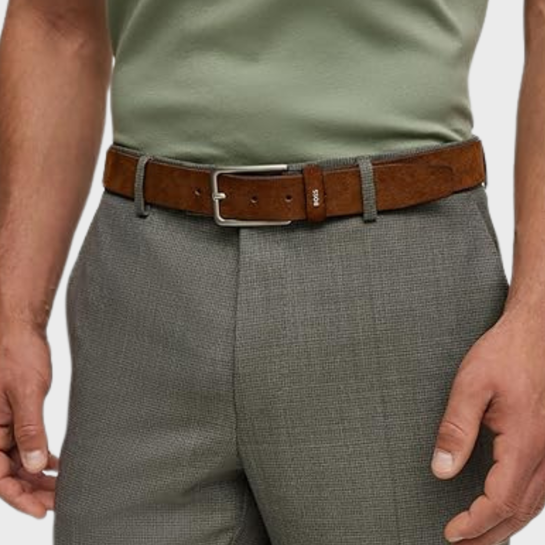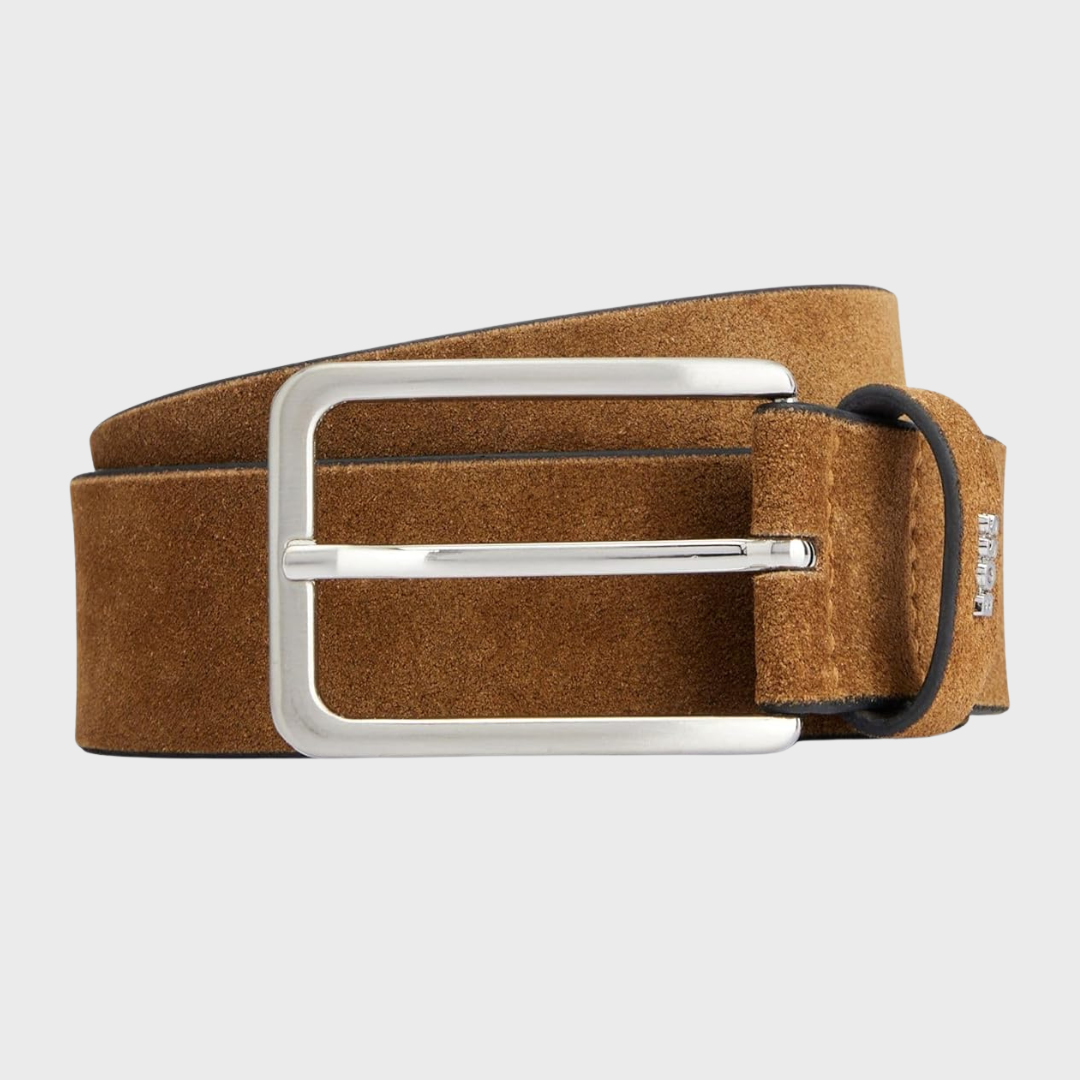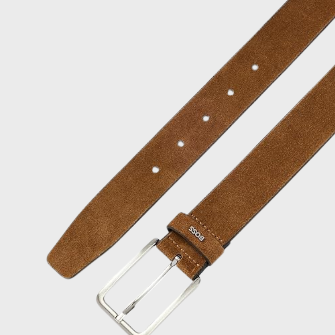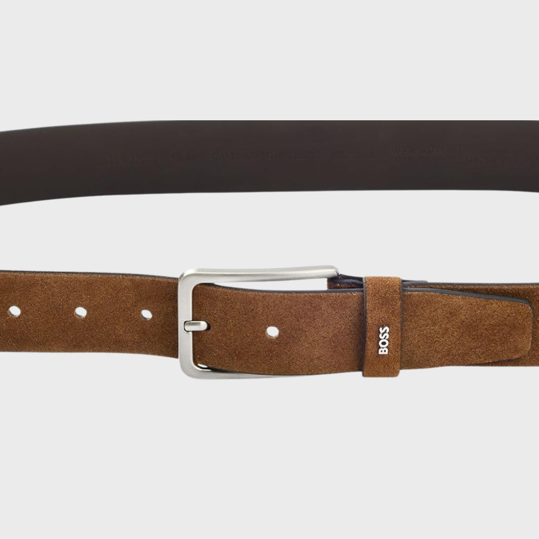 A 3.5cm belt in soft suede by BOSS with a silver-tone pin buckle and metal logo on the loop.