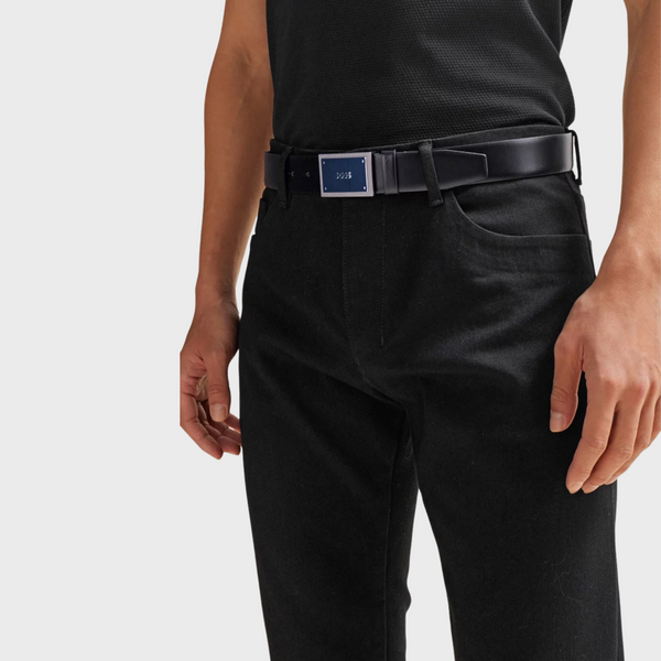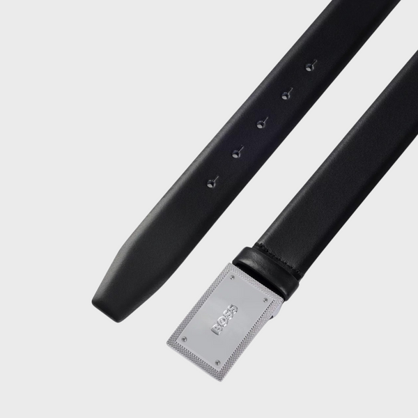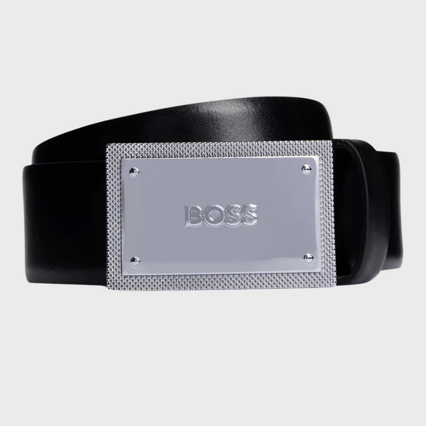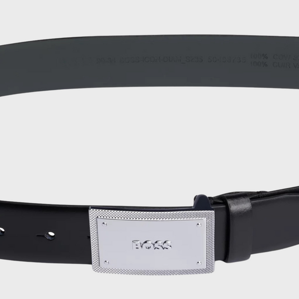 A 3.5cm belt crafted in Italian leather with a plaque buckle featuring engraved branding and textured edges by BOSS. For the best fit, we advise ordering a belt one size larger than your waist size. Metal plate with engraved logo Width: 3,5 cm (1.4 inches) Hardware finishing: Matte gunmetal hardware Partially lined