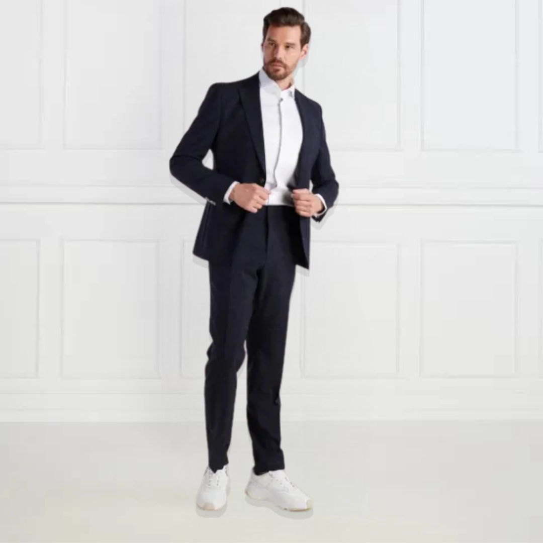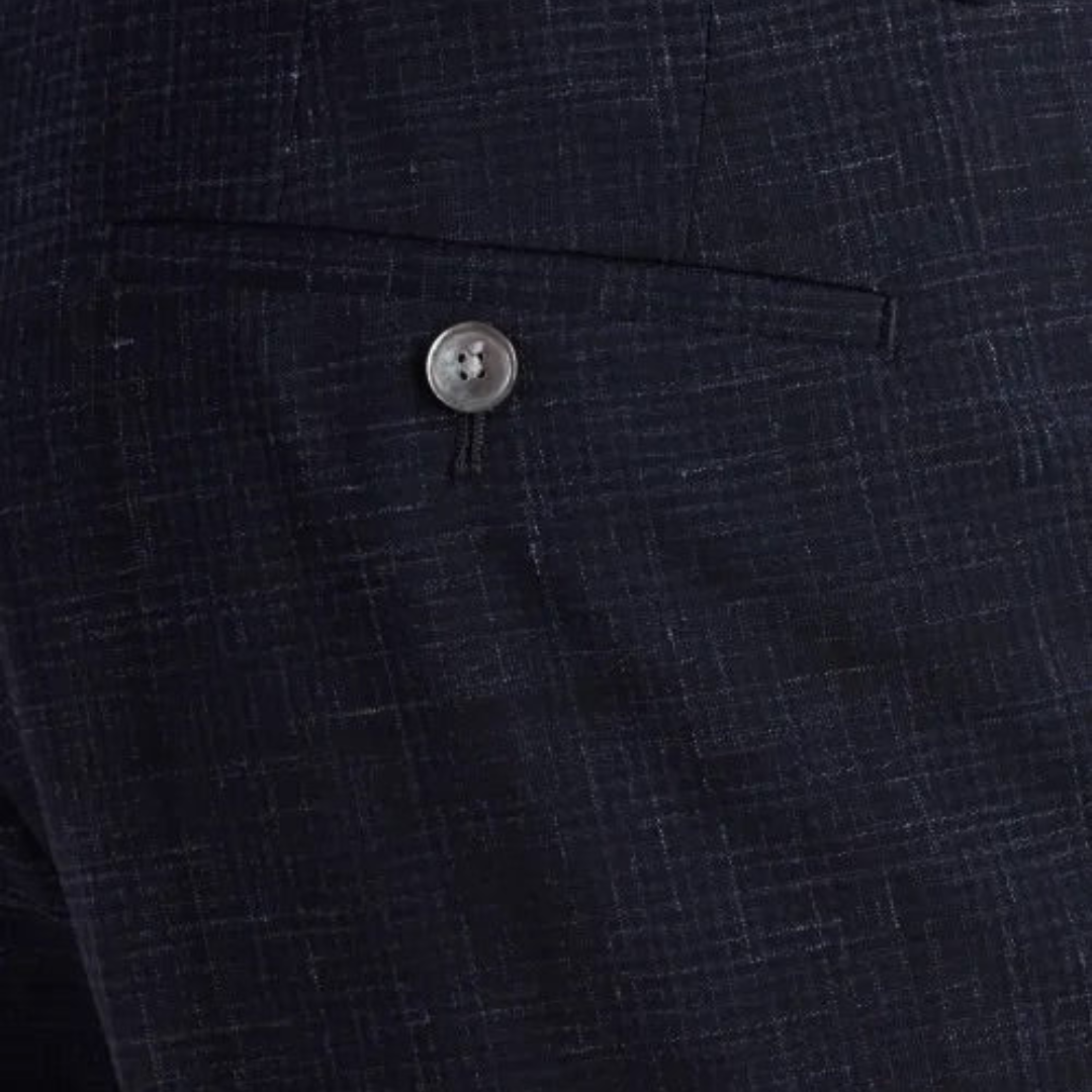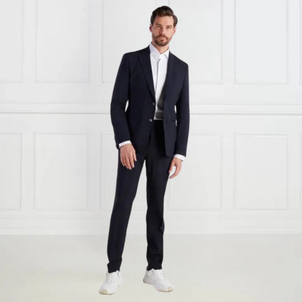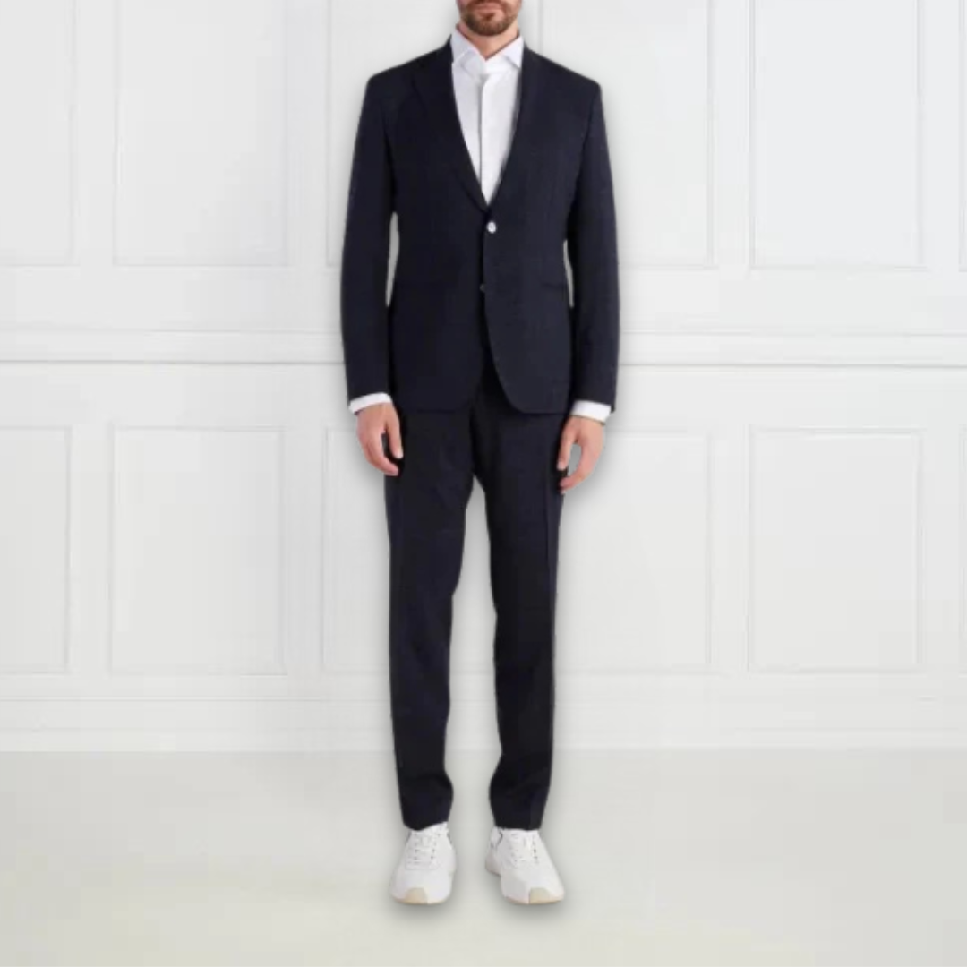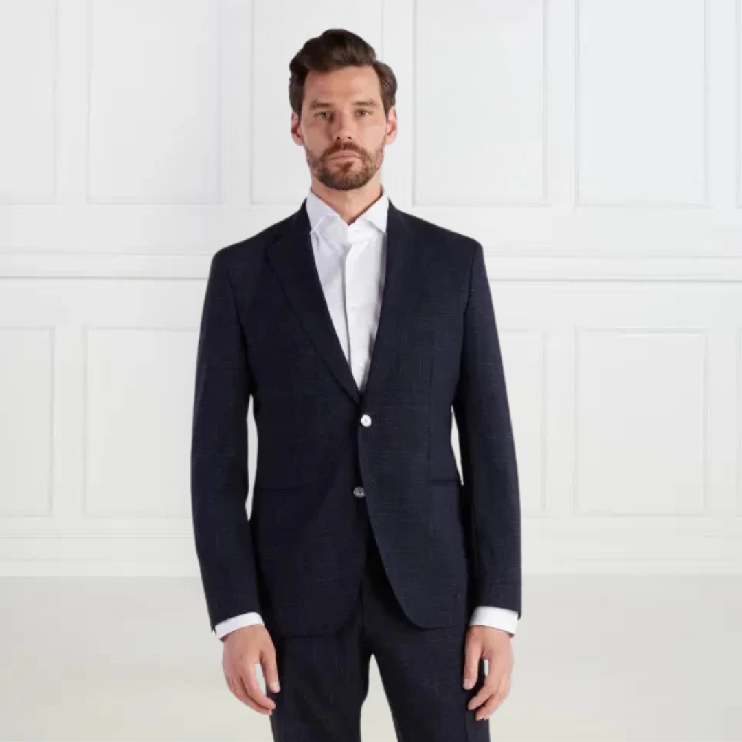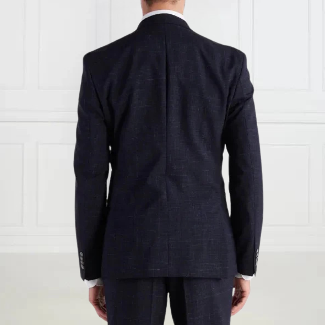 | This BOSS Menswear men's suit features a slim fit with a woven check pattern and chambray effect for a modern look. The jacket boasts a classic lapel collar, single-breasted style, chest welt pocket, and side slits, while the trousers feature a straight waistband with slanted front pockets and buttoned welt pockets at the back for a polished finish. |