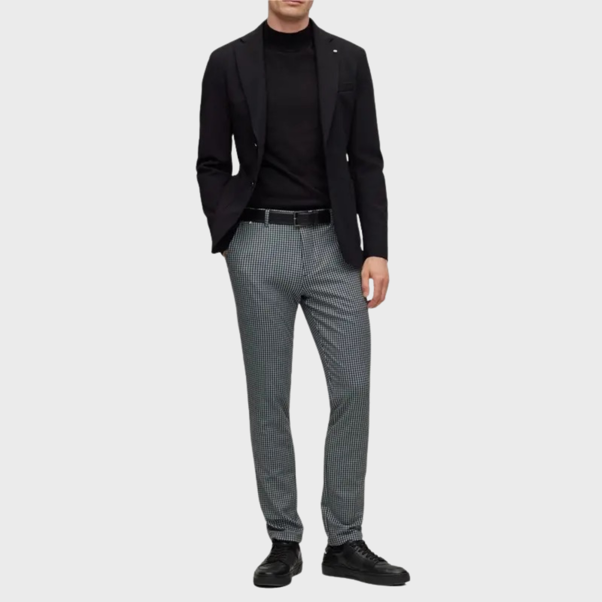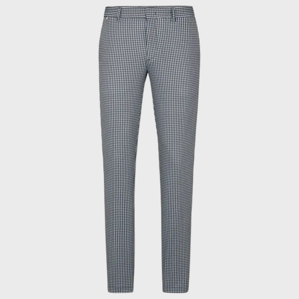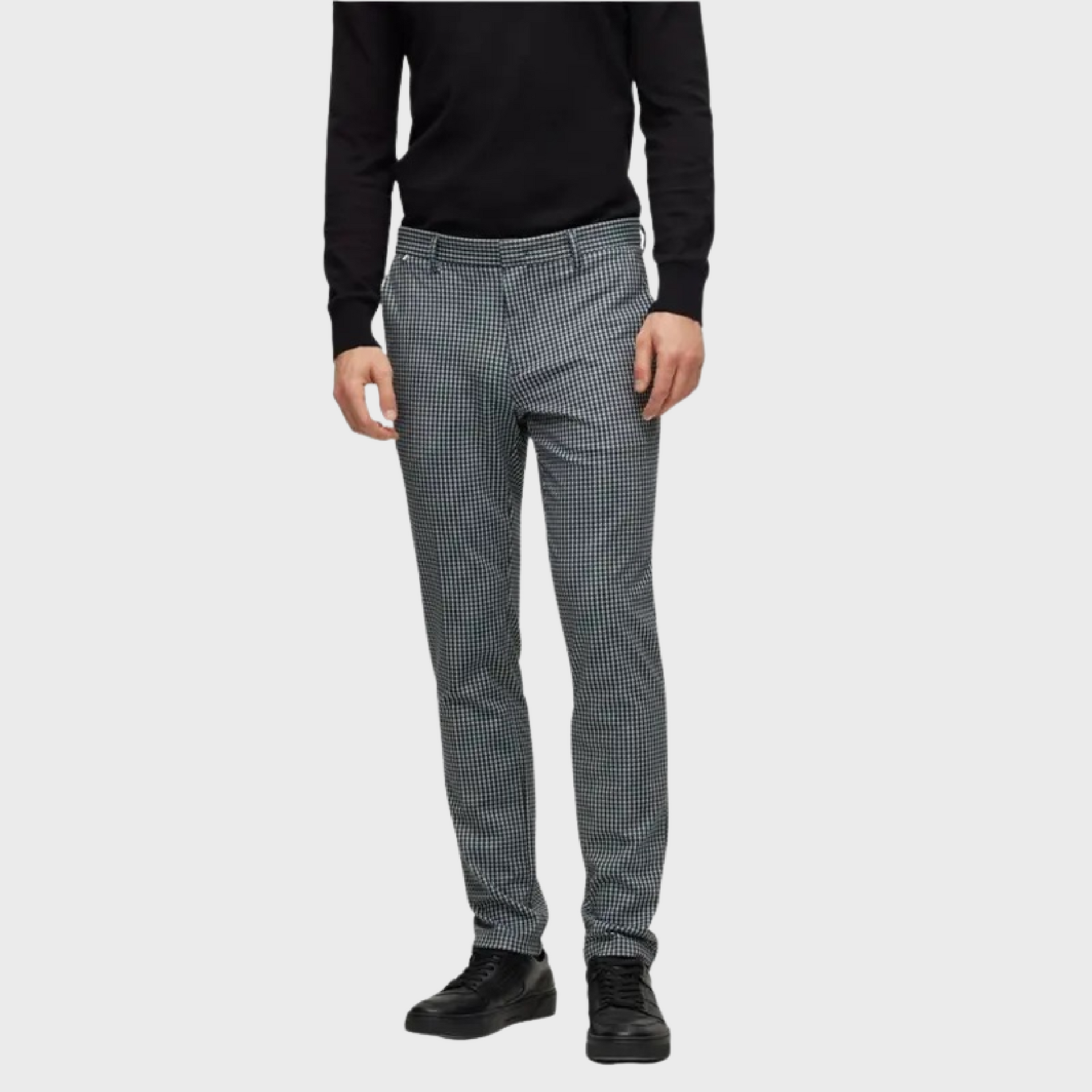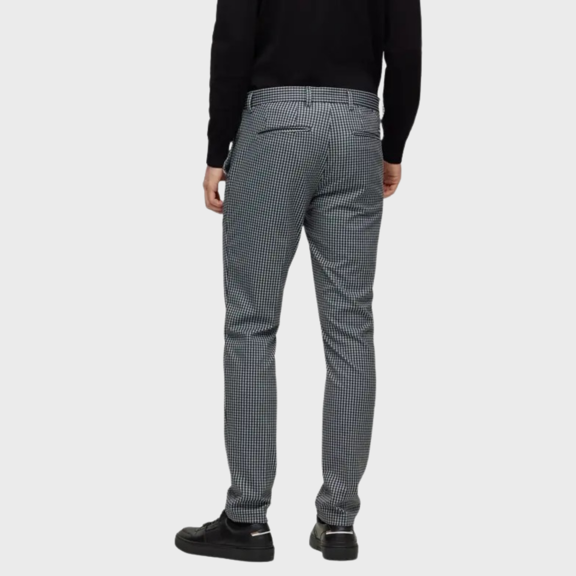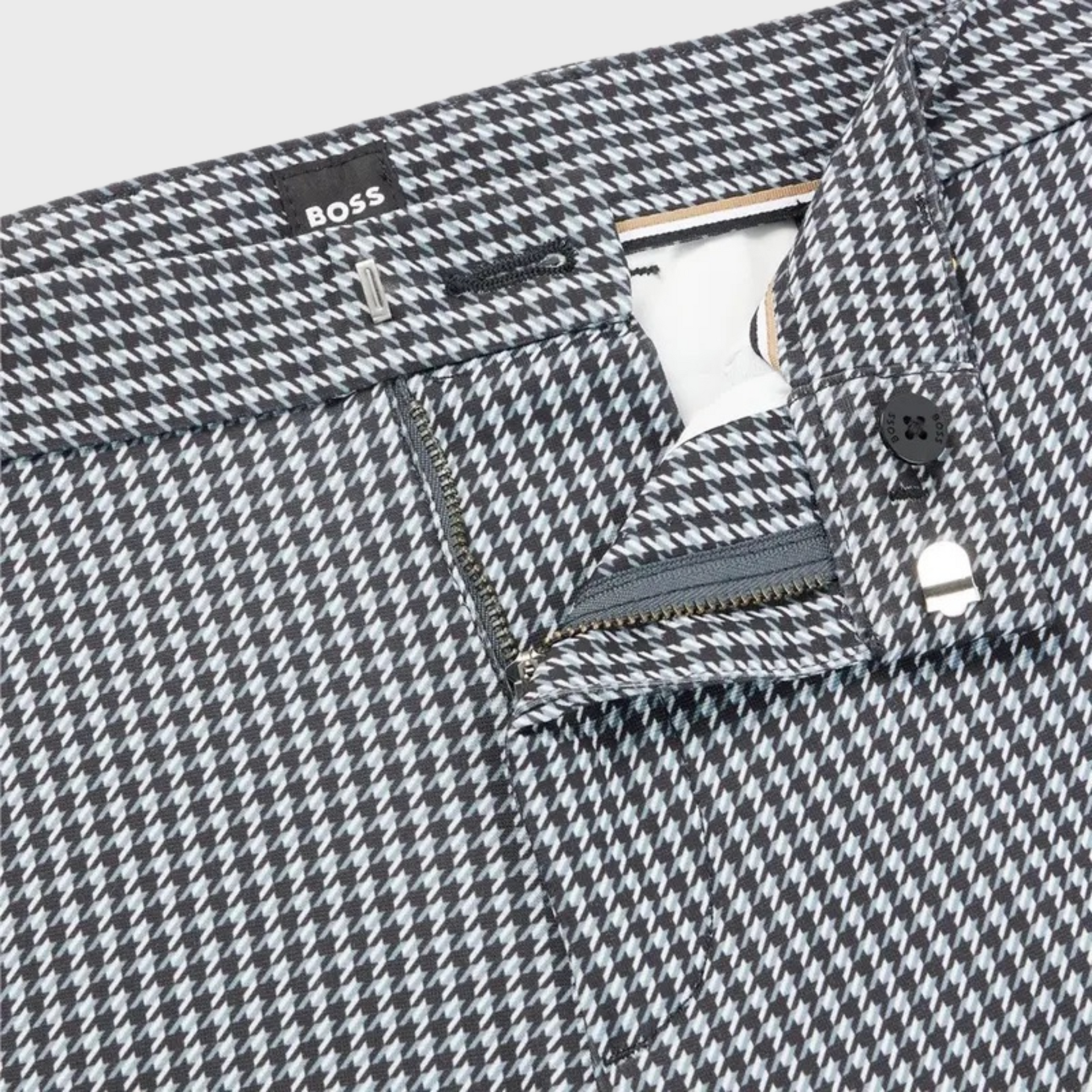 | These BOSS Menswear chinos are cut to a slim fit with a regular rise, crafted from stretch jersey printed with a micro check for a modern look. Featuring a hook and zip closure, counter button, French front pockets, and jet back pockets, they offer a sleek, tailored fit with a foot width of 34.0 cm. |