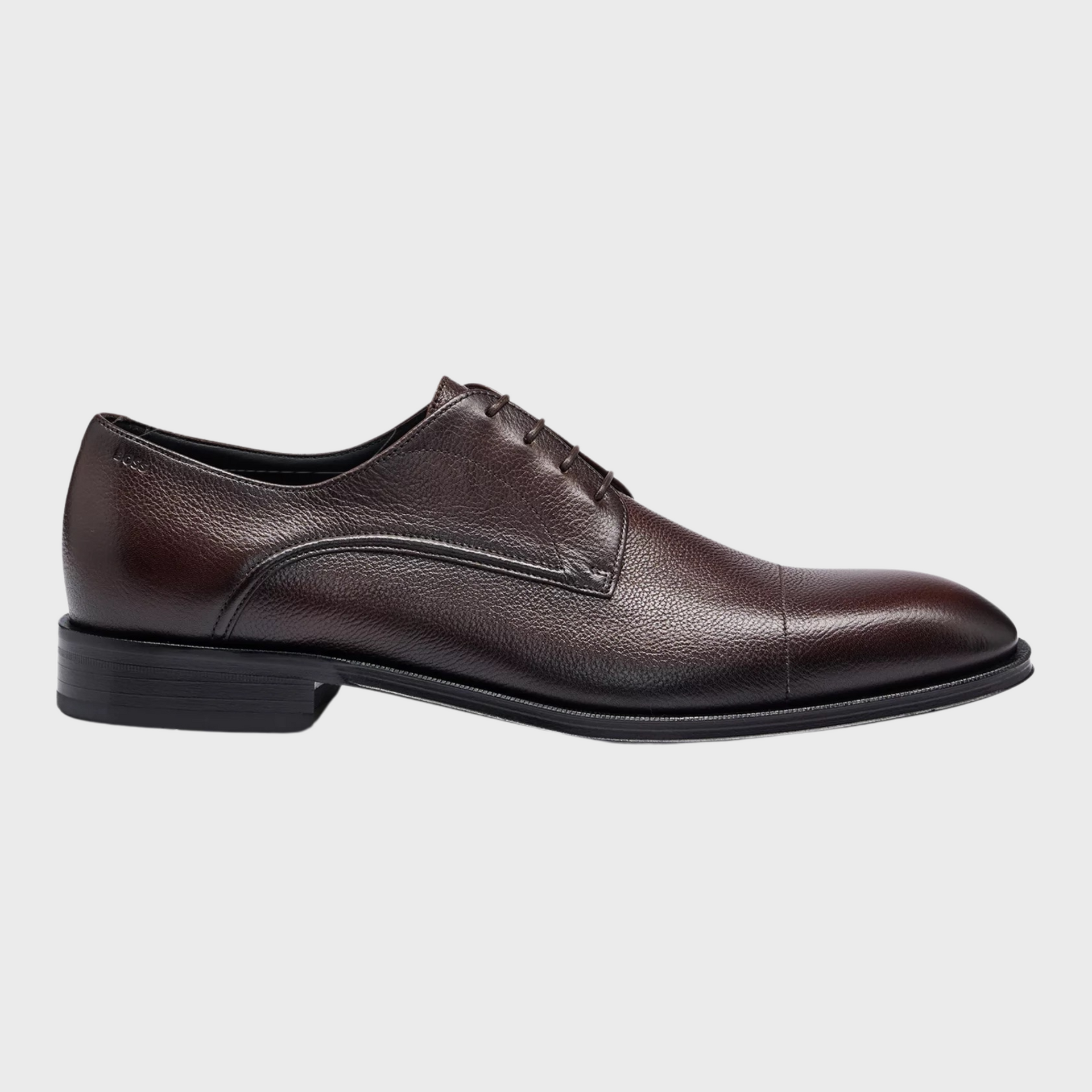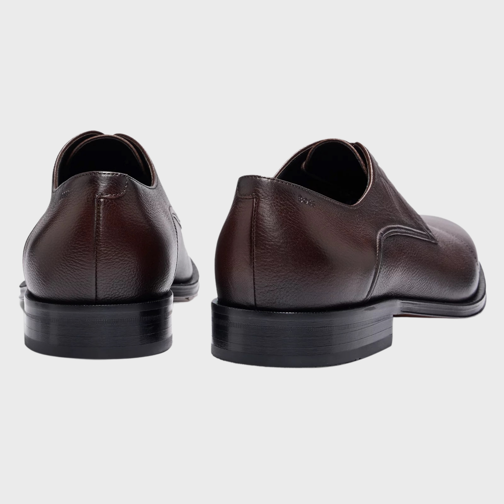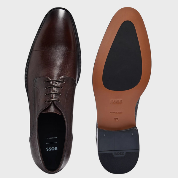 | Italian-made Derby shoes in grained leather with an embossed logo and a leather outsole with a rubber injection by BOSS. Sole: Leather/other material Fully lined Laces Packaging: Box |