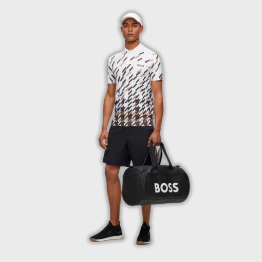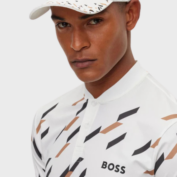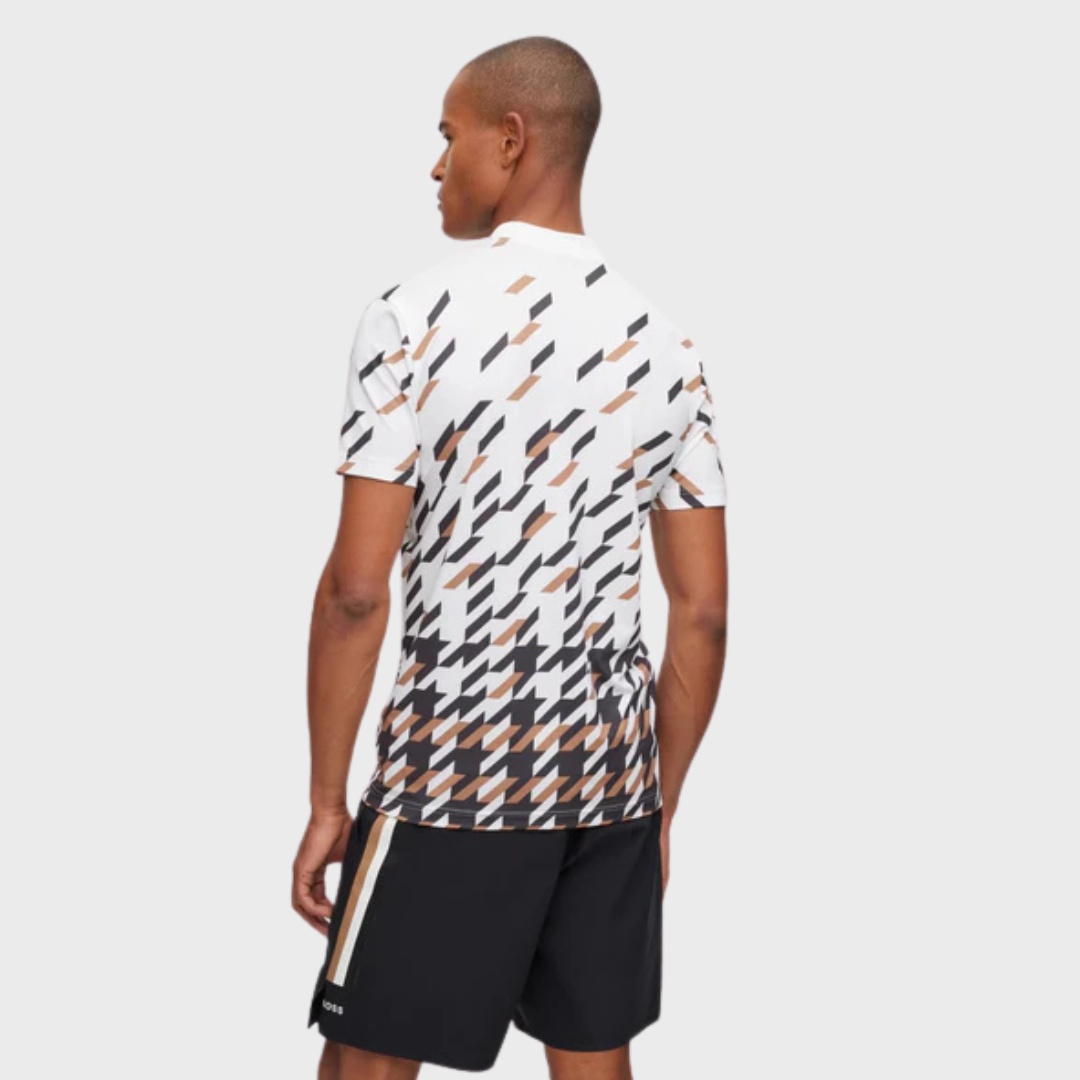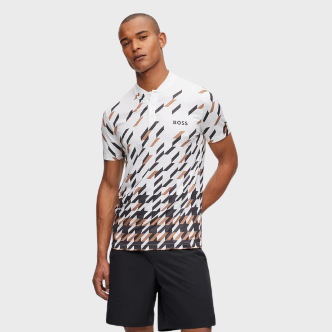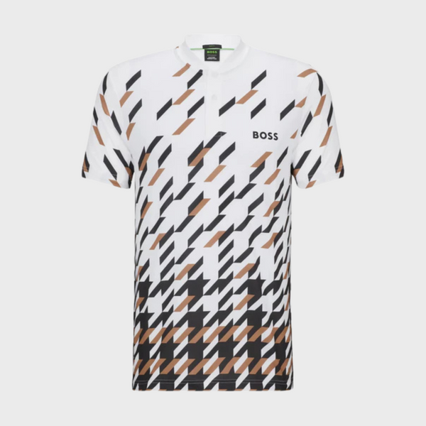 | A distinctive slim-fitting polo shirt in stretch jersey with a modern houndstooth print and branding by BOSS Menswear. Part of the dynamic BOSS x Matteo Berrettini capsule collection, co-created by the Italian professional tennis player. Slim fit Neckline: Stand collar Number of buttons: 2 Short sleeves Standard length |