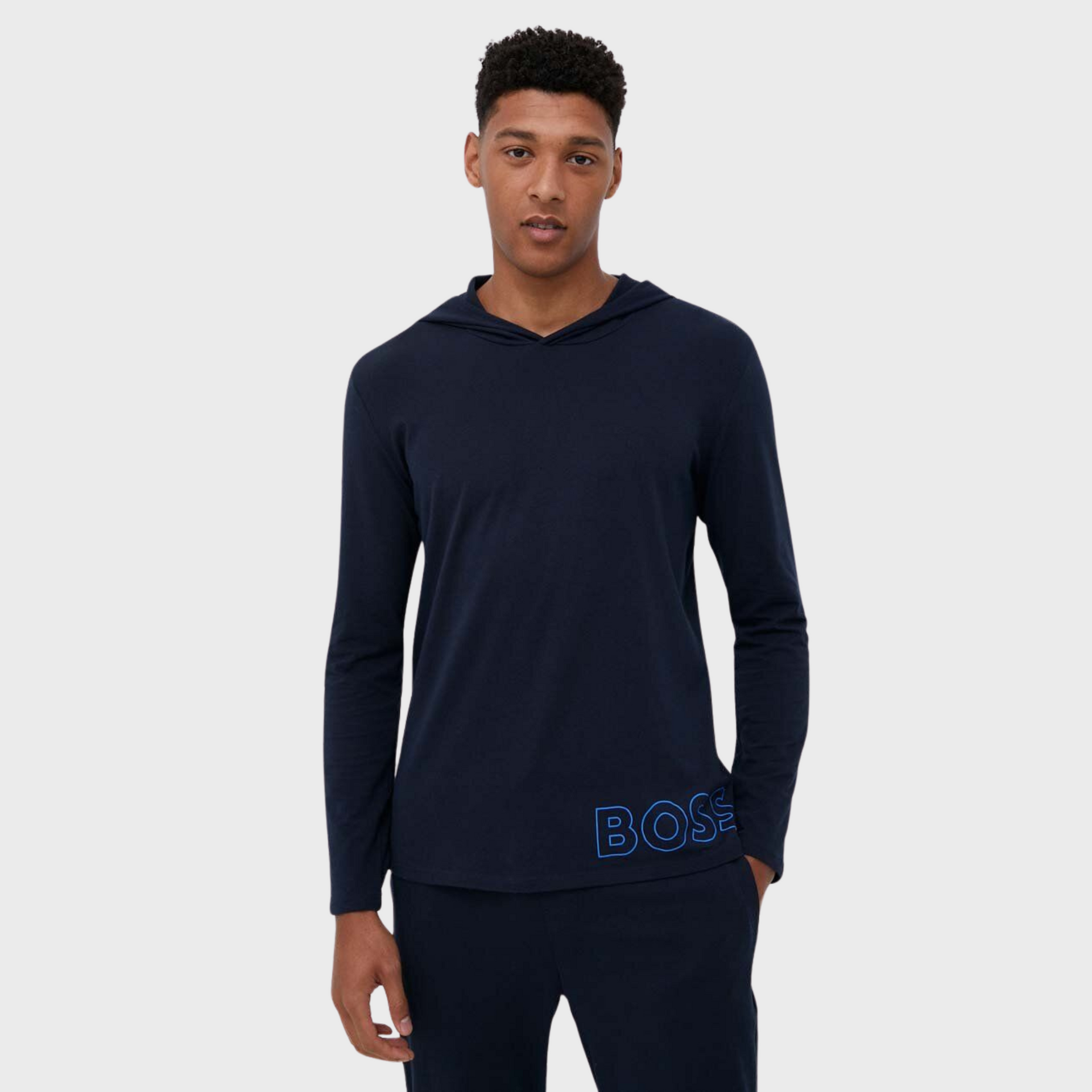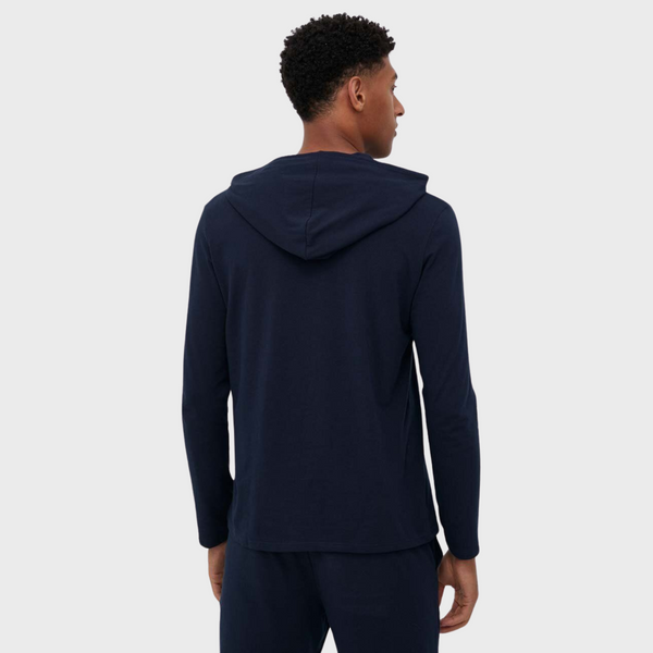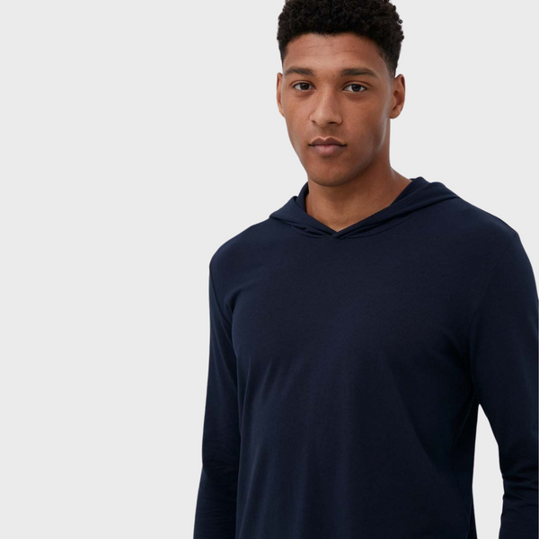 | This classic fit pyjama T-shirt features a solid pattern, long sleeves, and a hooded neckline. With a drawstring closure, it offers a comfortable and relaxed style for lounging. |
