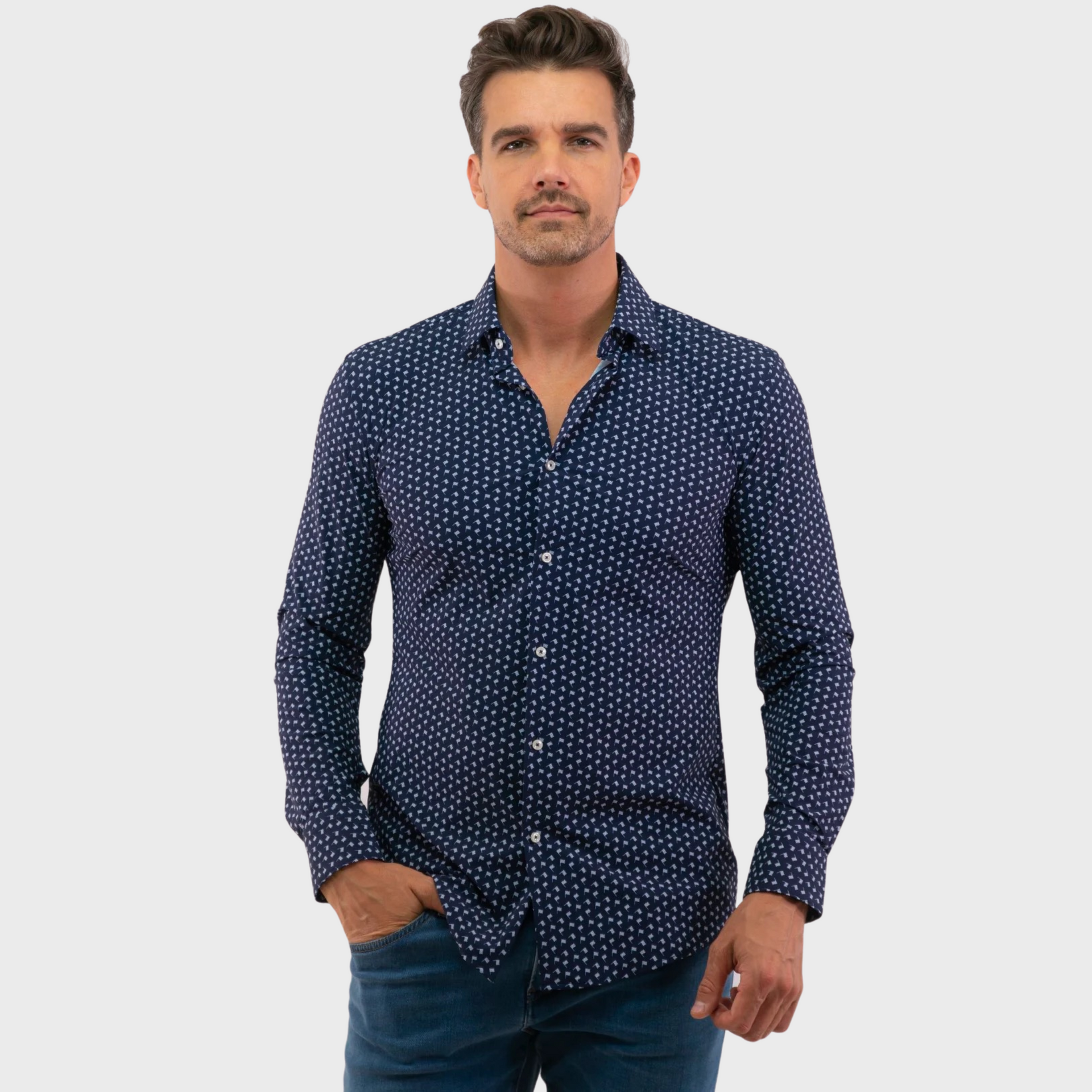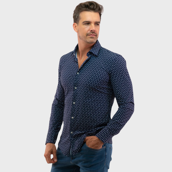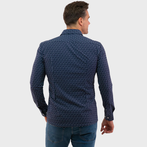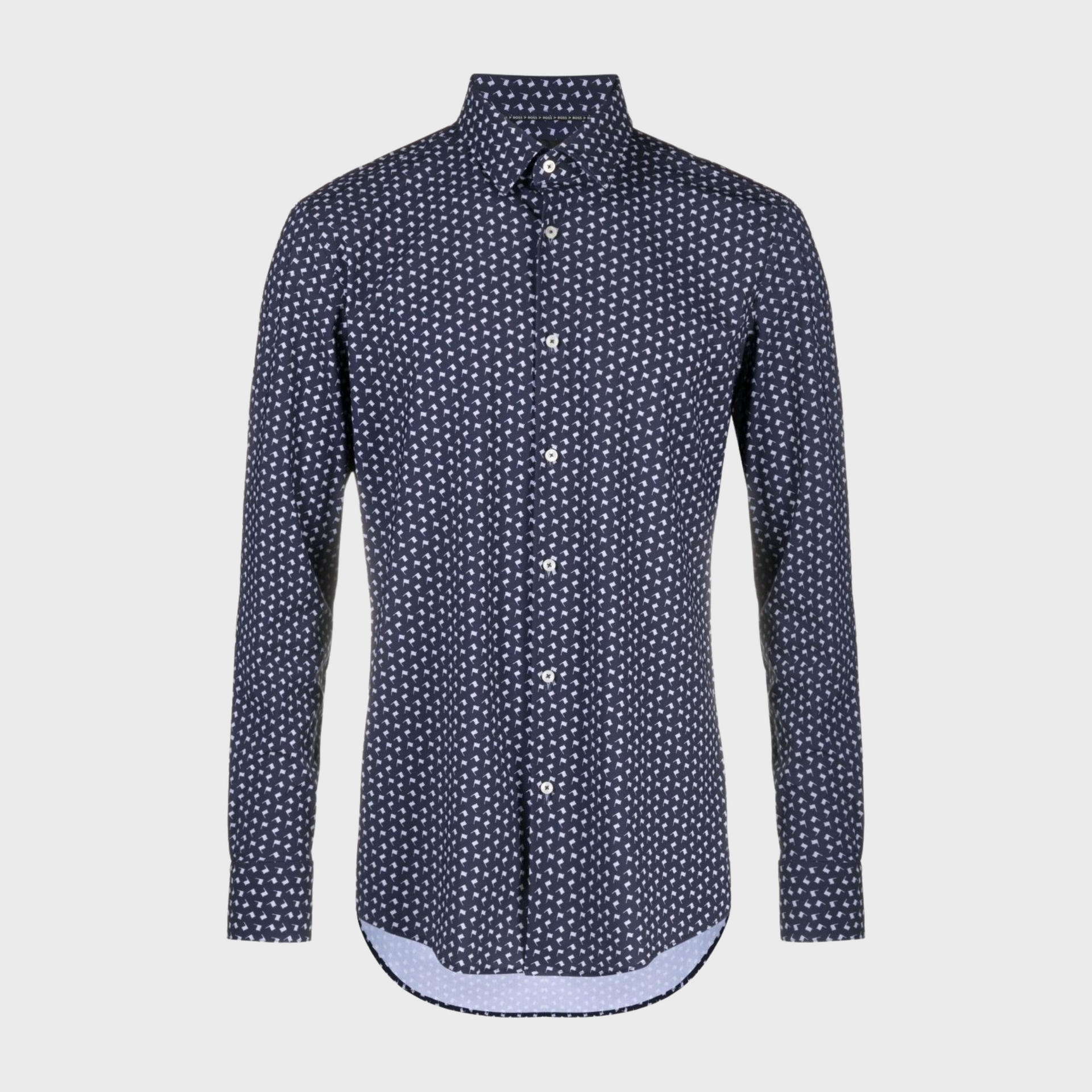 | This BOSS shirt in dark blue features a semi-Italian collar and long sleeves. With a button closure and subtle print, it’s perfect for daytime wear and offers a refined yet casual look. |