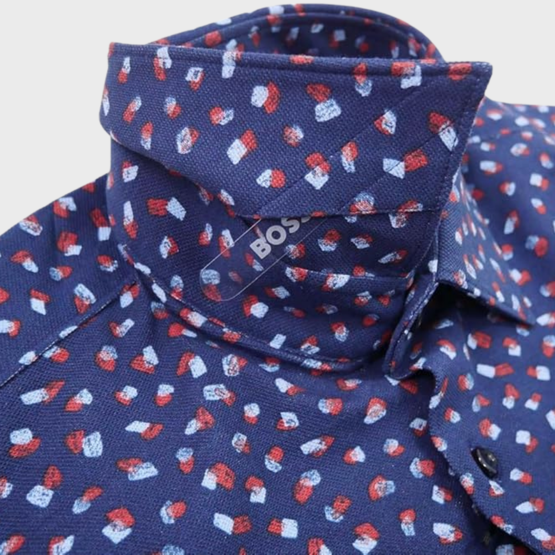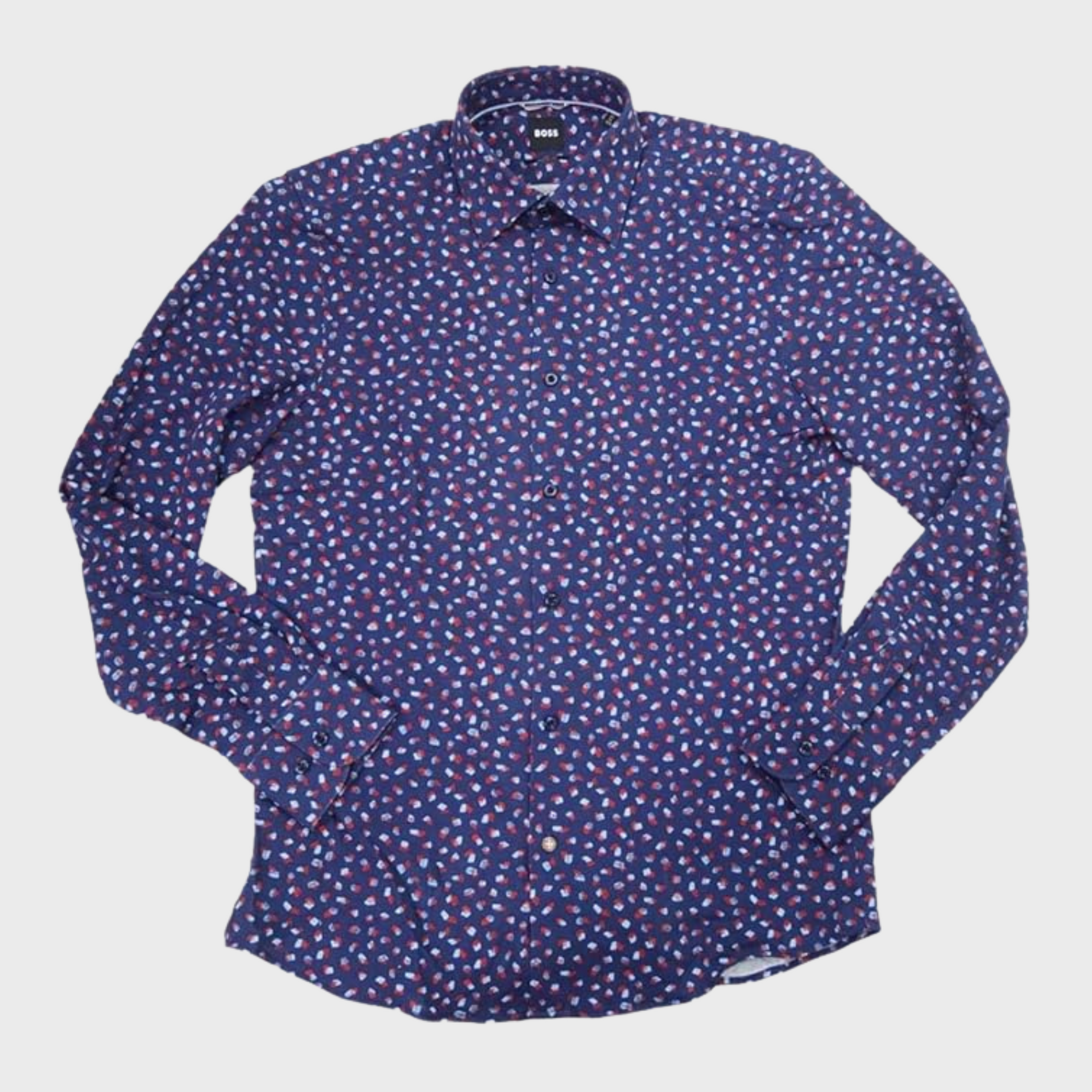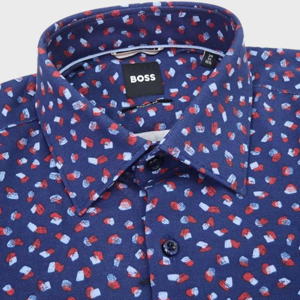 Product Description: This Hugo Boss slim-fit shirt features a collared neckline and squared cuffs, offering a sharp and modern look for a refined, stylish appearance.