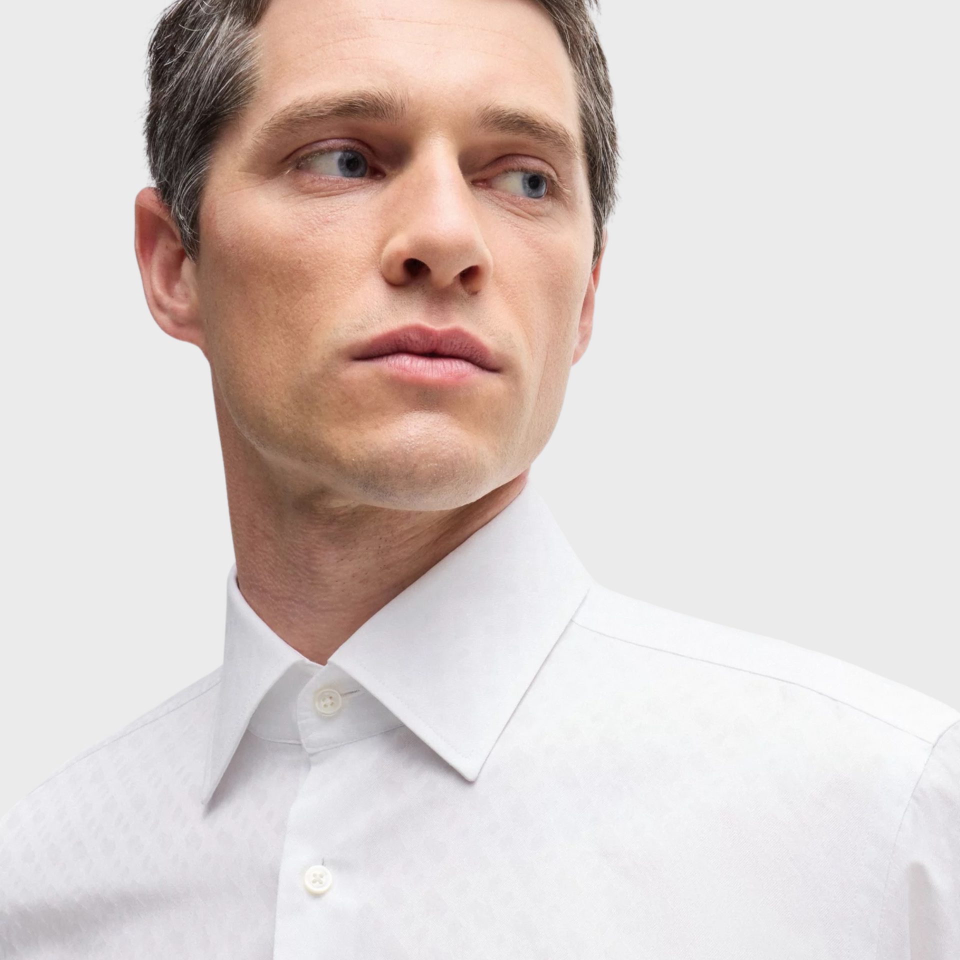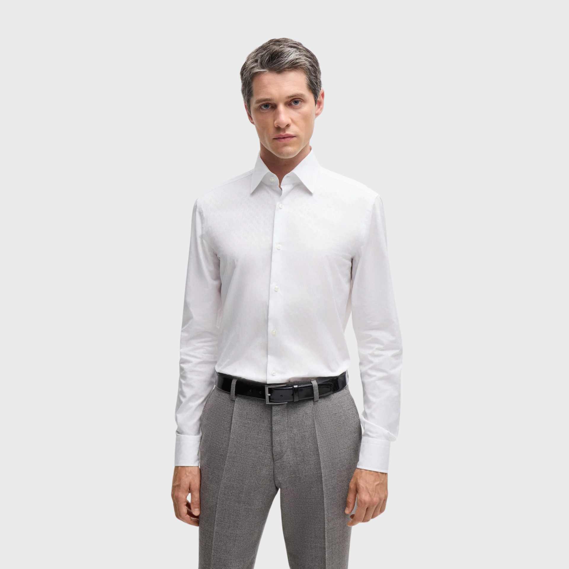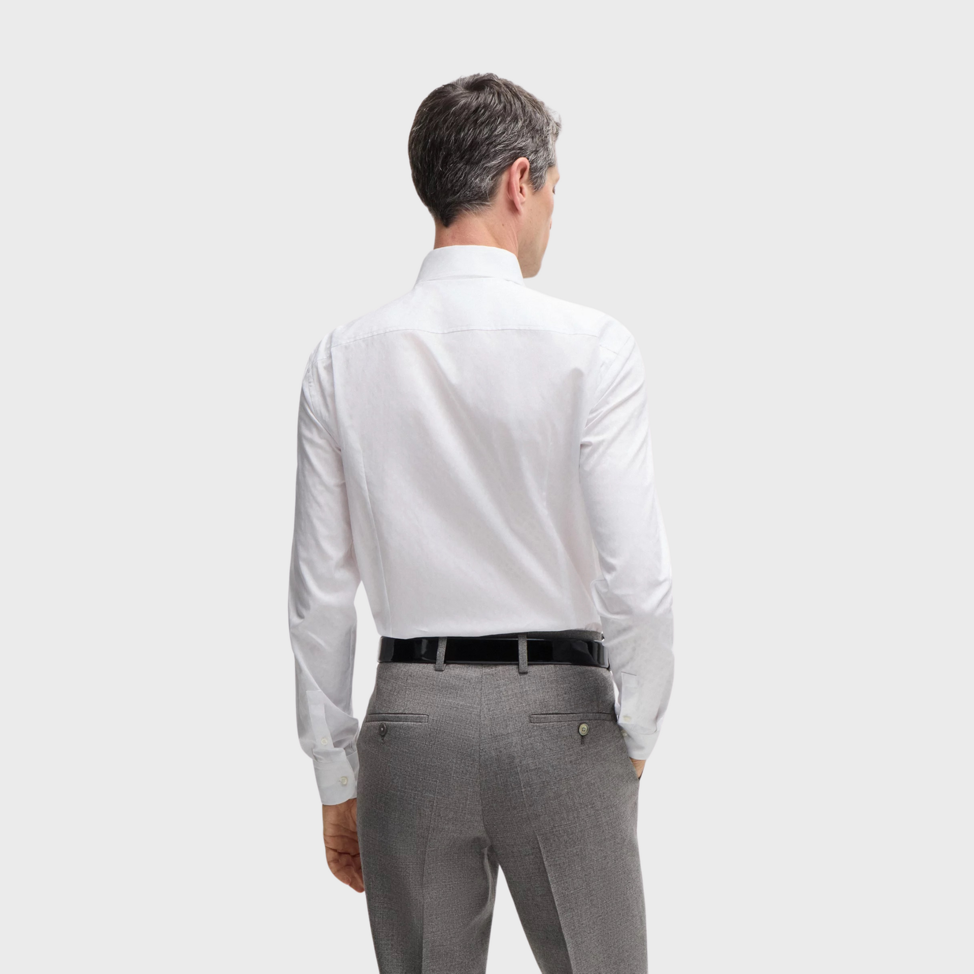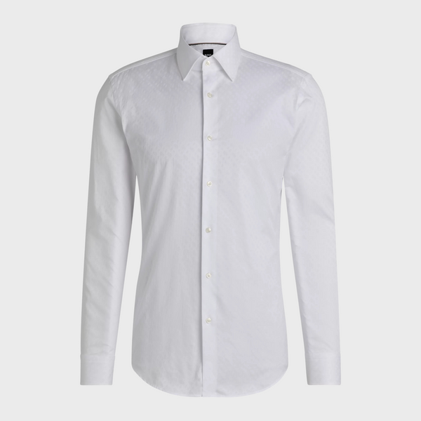 This BOSS stretch-cotton twill shirt in cream white features a spread collar, front button fastening, and long sleeves with buttoned cuffs. The twill weave and curved hem offer a sleek, comfortable fit with added stretch for ease of movement.