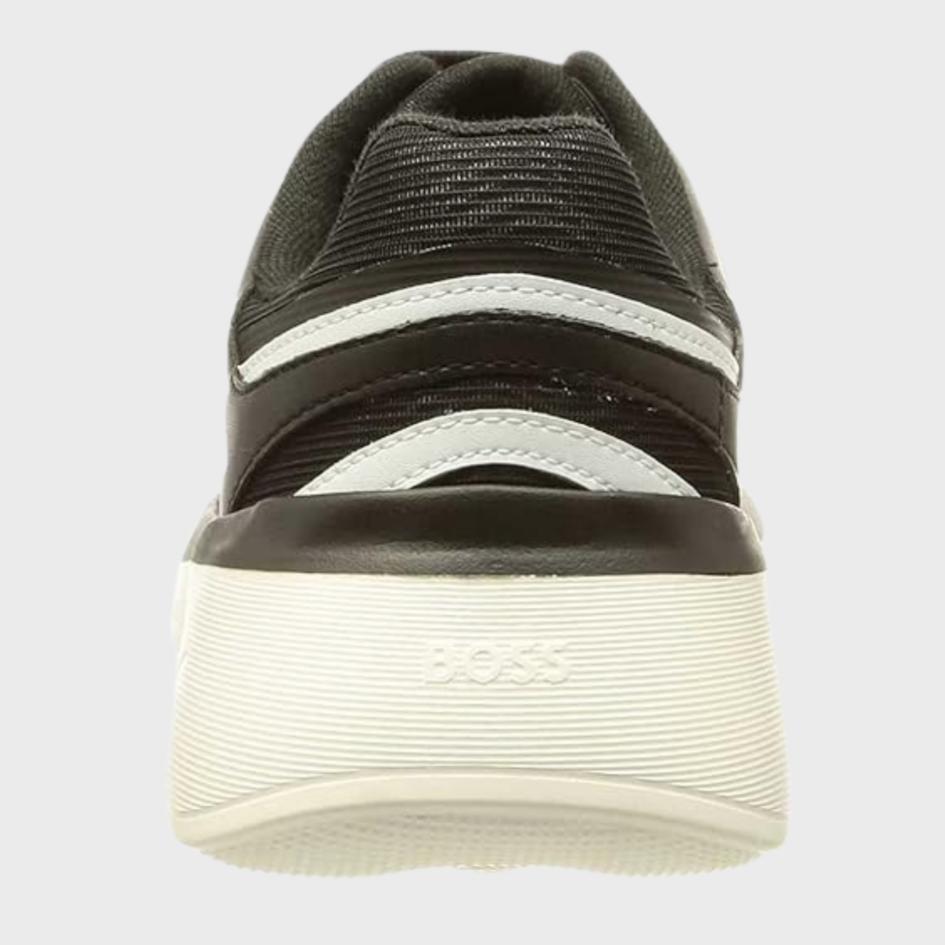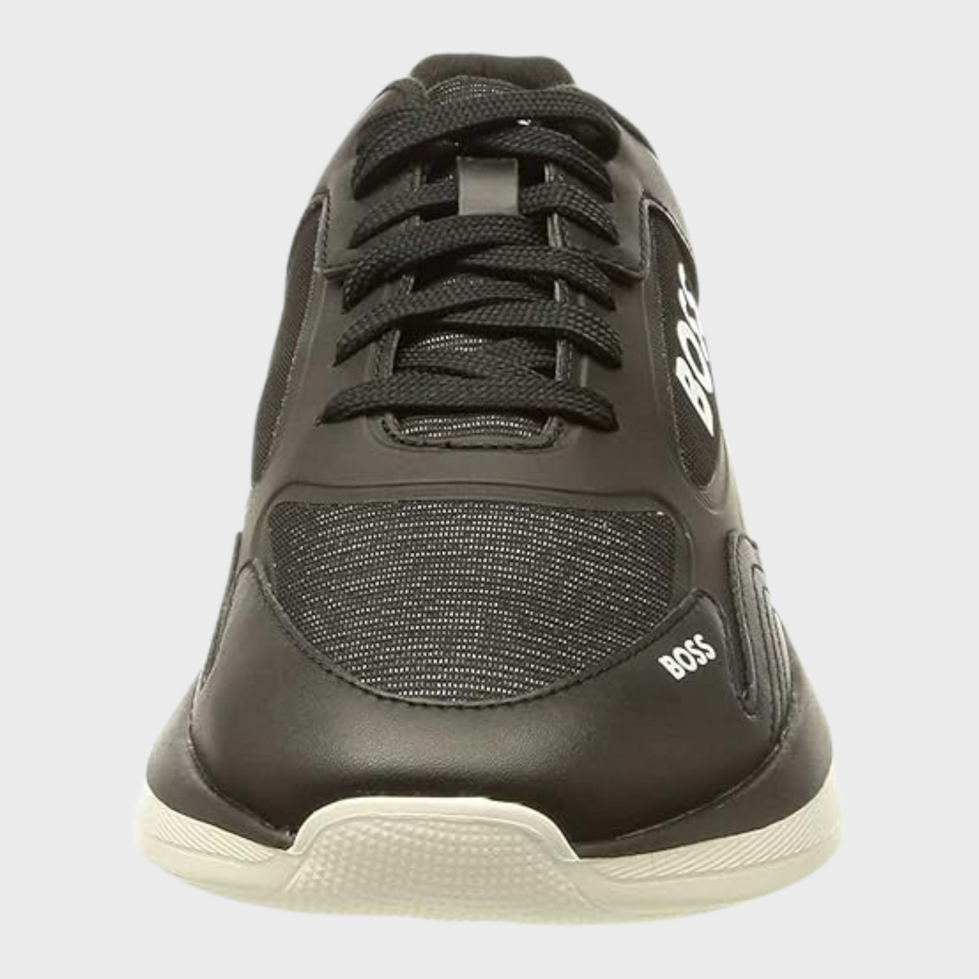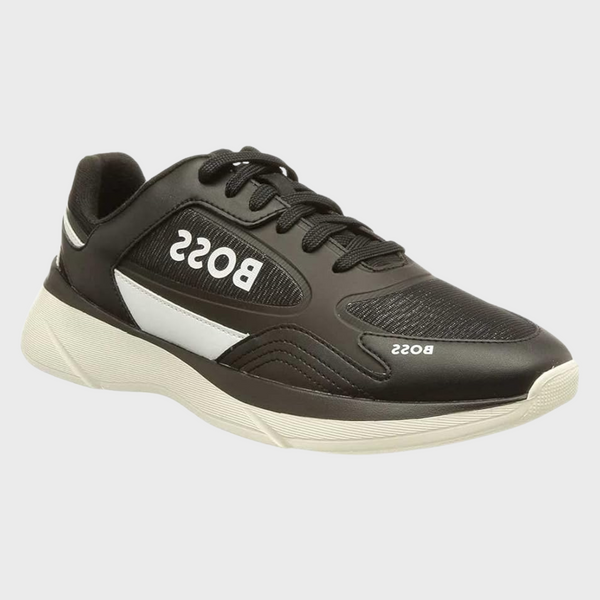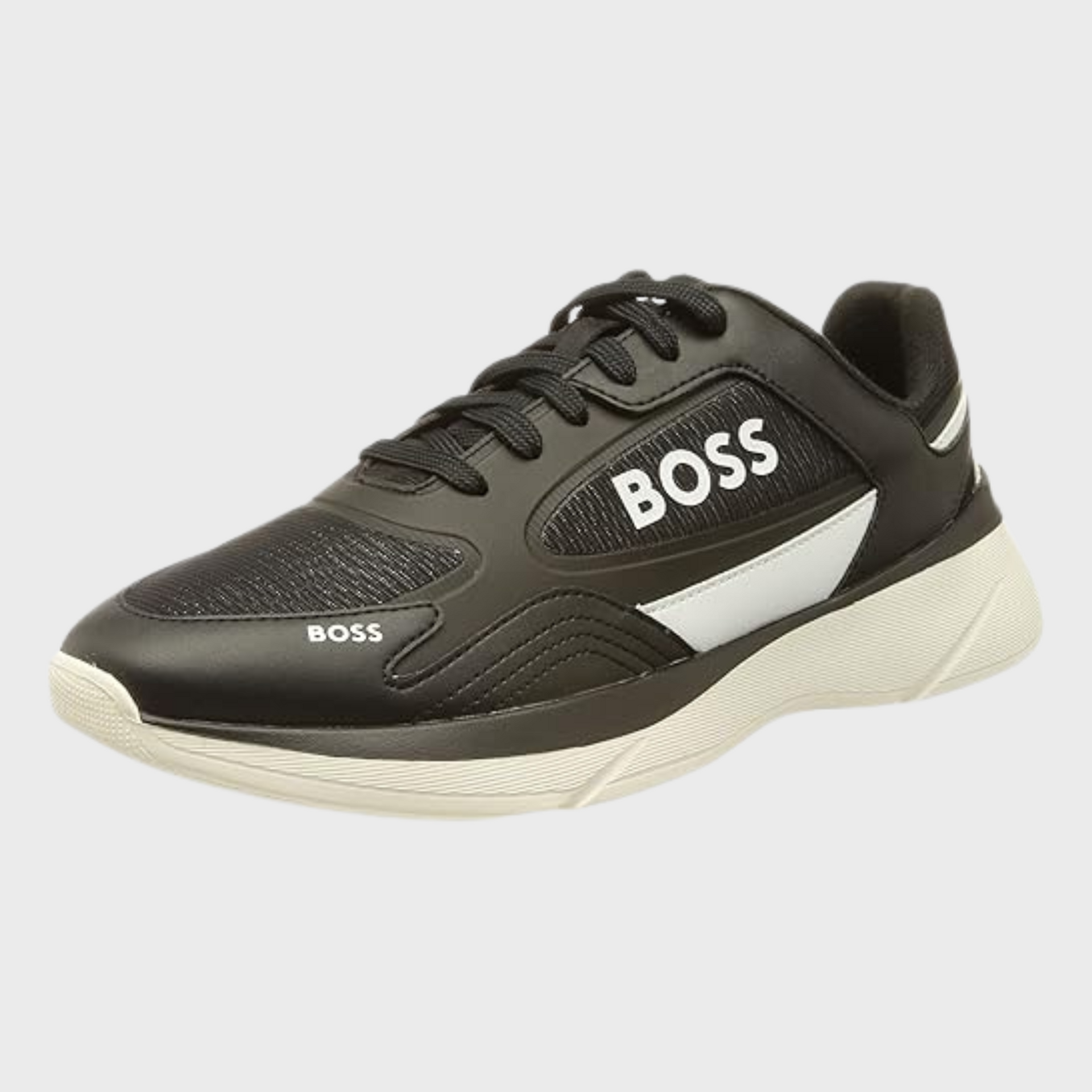 | The BOSS Dean Runn Lace-Up Trainer Shoes in white are designed for men, combining a narrow toe shape and wide fit for a modern and comfortable athletic style. Featuring a durable polyester upper and lightweight EVA sole, these luxury sports shoes are perfect for casual occasions |