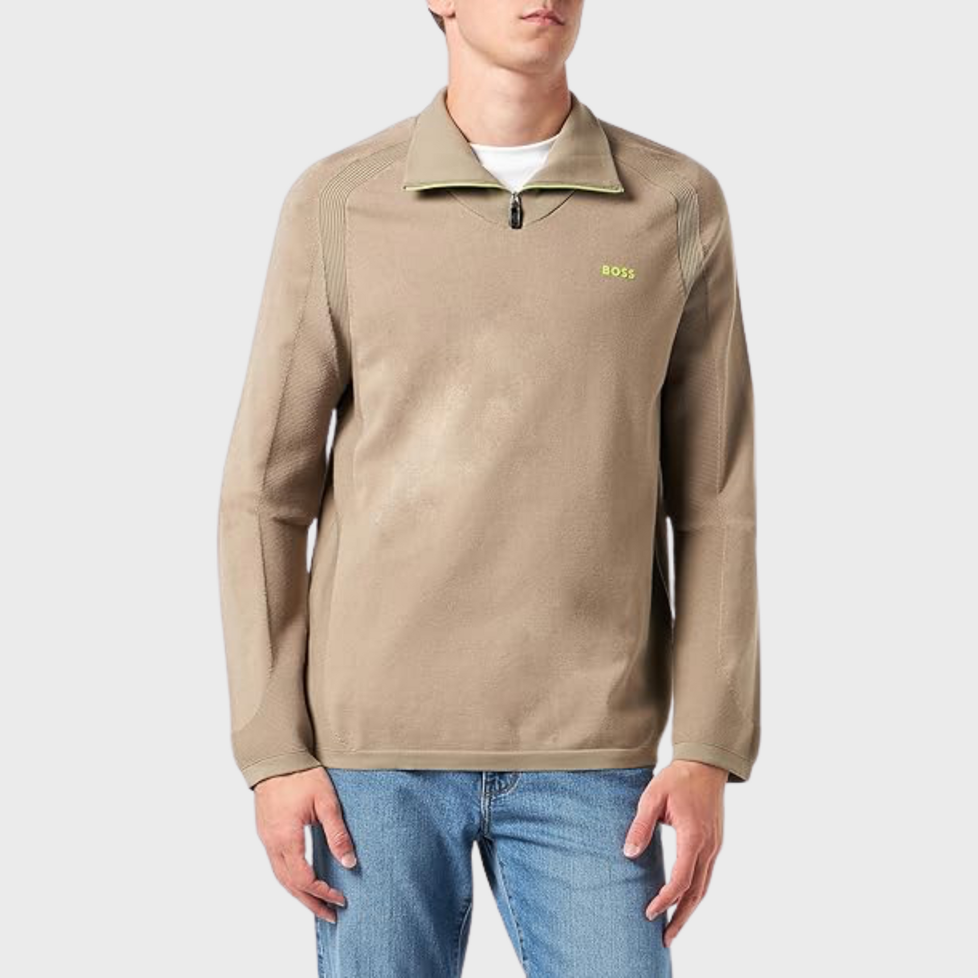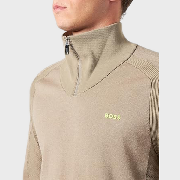 | Achieve a contemporary look with this lightweight, breathable mid-layer featuring a quarter-zip placket, cosy funnel neck, and the iconic BOSS logo. Designed for comfort and freedom of movement with added stretch, rib-knit cuffs, and a soft-hand finish. |