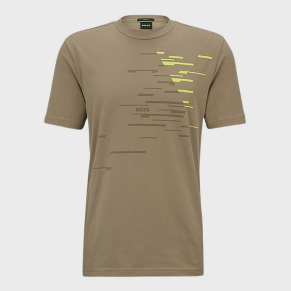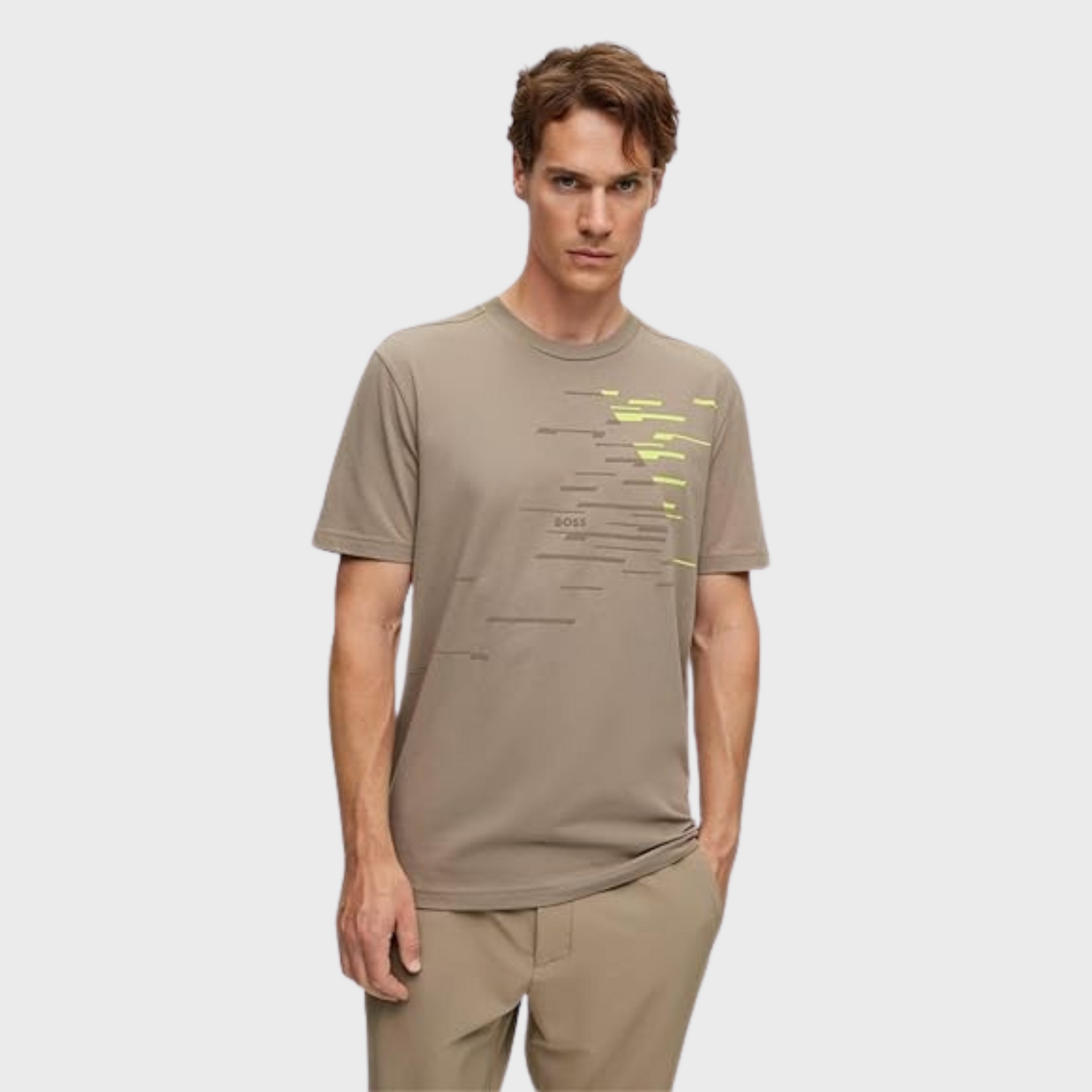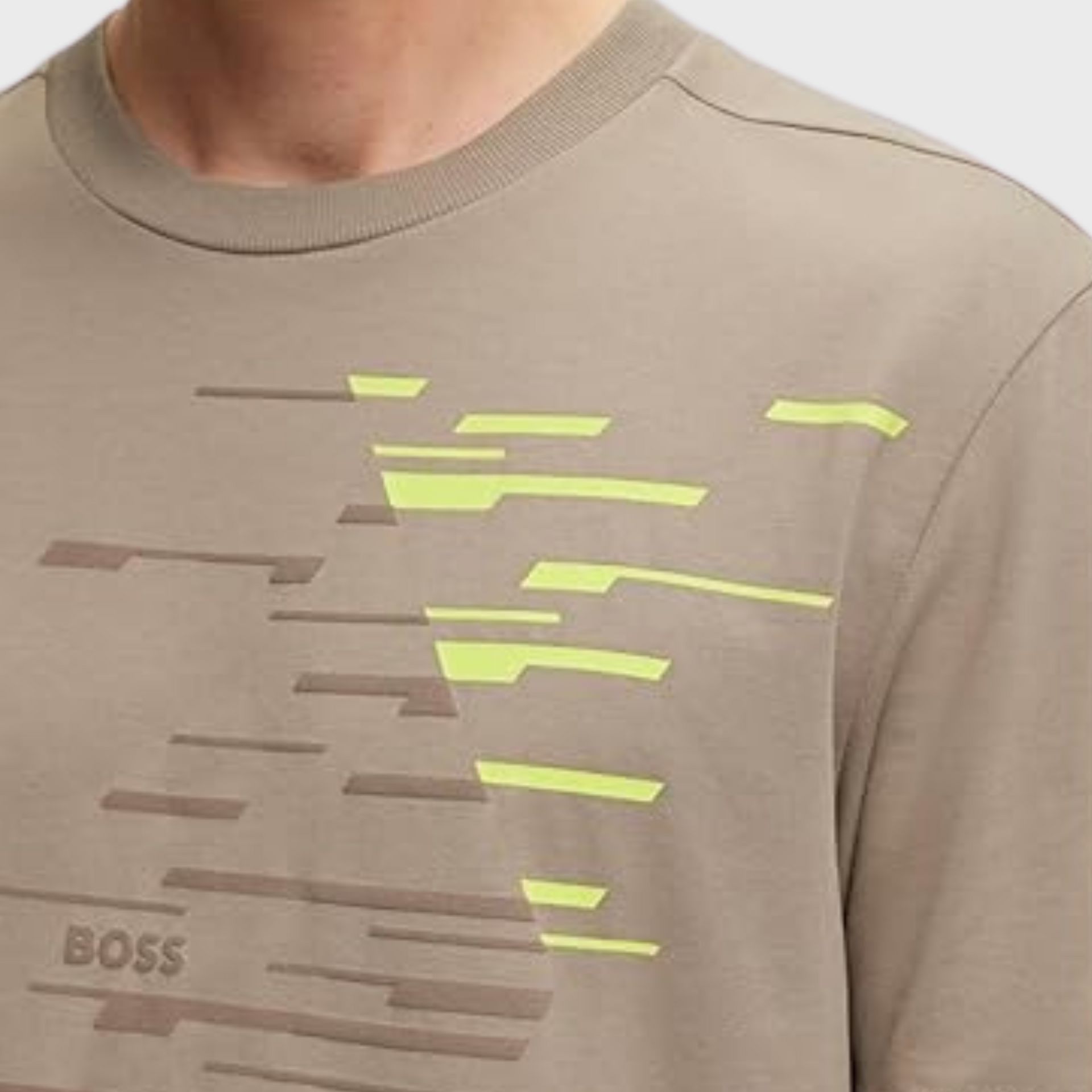 Men's t-shirt with crewneck, from the BOSS collection by Hugo Boss. It is decorated with an artwork print as well as the famous BOSS collection logo on the chest. Made of cotton fabric, in regular fit.