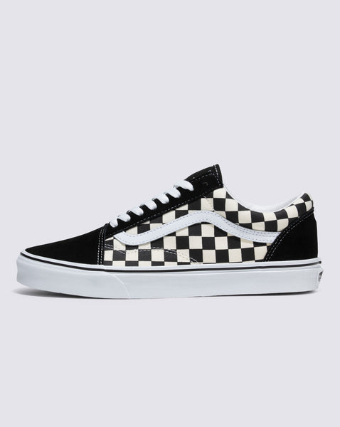 "First known as the Vans #36, the Old Skool debuted in 1977 with a unique new addition: a random doodle drawn by founder Paul Van Doren, and originally referred to as the ?jazz stripe.? Today, the famous Vans Sidestripe has become the unmistakable-and instantly recognizable-hallmark of the Vans brand. Constructed with durable suede and canvas uppers featuring a vibrant checkerboard print, the Primary Check Old Skool pays homage to our heritage while ensuring that this low top, lace-up shoe remains as iconic as ever. It also includes re-enforced toe caps, supportive padded collars, and signature rubber waffle outsoles.